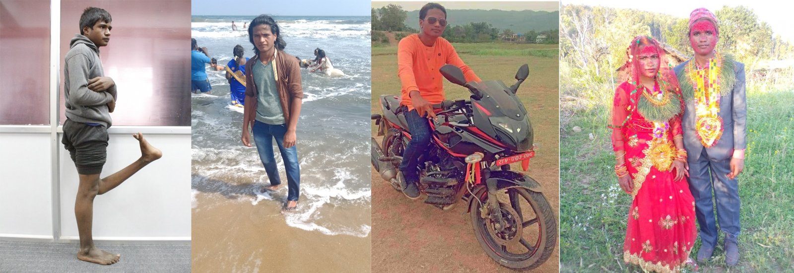 At FOD, he underwent a lengthy corrective surgery on his leg, followed by months of rehabilitative physiotherapy. He finally hit the ground again! He was delighted that he didn’t have to carry his broken leg or hop on his normal one, a sight that often had made him the center of jokes and laughter. In a wonderful illustration of how his identification and subsequent treatment and rehabilitation have impacted his social life, Prakash now works as a cook in South India, rides a bike, and recently got married. He is a happy young man who is pursuing a life of independence and dignity!