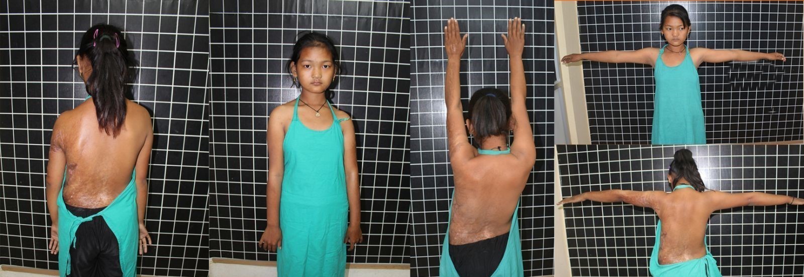 Little Sumita fell into the household kitchen fire and sustained severe burns to her back and left axilla. She survived but the scars caused her left arm to be plastered to her body. She comes from a daily-wages household with a laborer father, farmer mother and two siblings. In such rural households, it’s not uncommon for a small child to tend on a smaller child while the parent s are out working. Often the kitchen is no more than a corner of the room where the wood fire burns where such accidents occur.